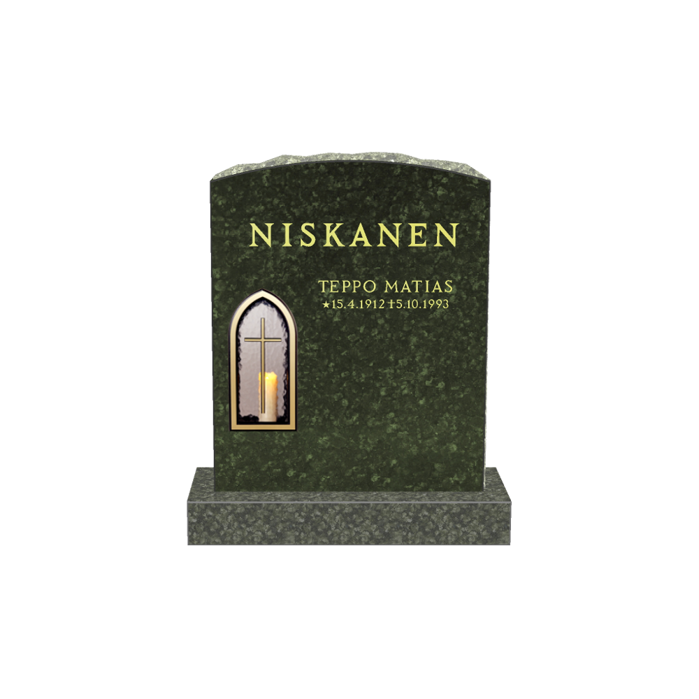 Kapea kaarikivi (70x55cm) valitsemallasi kivilajilla ja ristillä tai lyhtykehyksellä. Tekstit kivessä kaiverrettuna. Hiomme aina kiven etupinnan. Hiottu pinta pysyy pidempään kauniina ilman puhdistusta. Valitse muut hiottavat pinnat ennen tilausta. Jalkakivi sahatuilla pinnoilla.